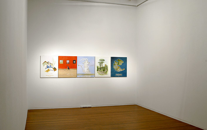Vivienne Shark LeWitt’s exhibition Misc. features five recent paintings in her distinctive cartoon-esque style. Traversing various subjects and moments in time, LeWitt has mined literary traditions, advertising and the natural world to produce an eclectic group of paintings that reveal absurdities and conundrums in contemporary experience. History, parables, human foibles and social graces are all examined with characteristic wit and nonchalance. In Cease and Desist (2006) LeWitt has recreated a scene from Hillaire Belloc’s Cautionary Tales for Children (1907) where a bad child chases a piglet, clearly oblivious to the silent “tsks” from authority figures overhead. The small boy’s behaviour is at once amusing, repellent and familiar. LeWitt’s genius is her intuitive understanding of the human psyche: we recognise ourselves in these pictures and empathize with her portrayal of humanity. At the same time the pictures are satirical comments; spaces in which social norms we usually take for granted suddenly appear peculiar and arbitrary.