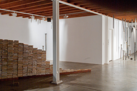 A long-term relationship ends. For some years prior to this, as part of a systematic strategy of recuperation against an insipient sense of loss, Liversidge transcribed by hand every text message he received on his mobile phone. Consequently, it turned out he had every message she had ever sent him. To illustrate fluctuations in velocities -- tensions and conditions of equilibrium -- within the relationship, he plotted on a graph the number of syllables he received from her each day by SMS for the duration of their time together. The data was then extrapolated into three-dimensions and placed in the gallery in the form of a sculptural bar chart. Nothing for nothing is over two metres high and almost seven metres long and is constructed out of approximately two thousand pulp romance novels. A tragic tale of boy-loves-girl-boy-loses-girl which escalates to a dramatic end is graphically illustrated via another failed relationship – the relationship between empirical data and its supposedly rational system of interpretation.