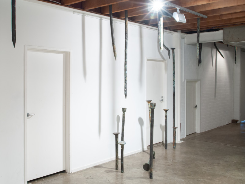 Yasmin Smith works with ceramic, altered found objects and is also a painter. Her surreal installation of giant corroded nails, If I could come near your beauty with my nails, penetrates the ceiling above and the floor beneath us like a forest of stalactites and stalagmites. Their near human scale draws out their inherent anthropomorphic qualities. This bent and aged community of somewhat caricatured figures goes beyond the surfaces that delimit the architecture that we inhabit to a space that is inaccessible to us. Another surprising aspect of these strange objects is their material construction. Rather than the rusted, hardened steel of which they appear to be made, they are in fact fired ceramic which the artist has patinated with copper and manganese. By using ceramic to represent metal, Smith initiates a dialogue between apparent strength and actual fragility.