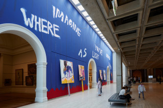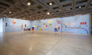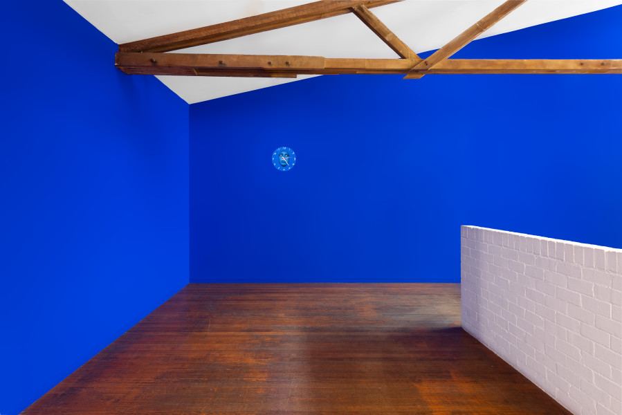 Softly painted out in the work watch and witness are the words ‘ancora ancora’ reminding us of the concept of time in Italian - to be ‘still still’. Ultimately steeped in Polo’s practice of observation, the engaged outsider becomes the insider as the artist inserts himself directly into the show as a clock. In an eight-hour video installation, clockwatch (linger), set to gallery hours, the artist surveys and watches whilst also performing, and at times absorbing completely into the blue wall, his final disappearing act. It is in these clever moments of lingering time, of stillness, that the roar and fervour of this exhibition makes sense.