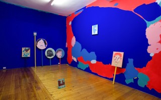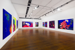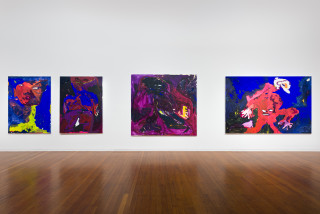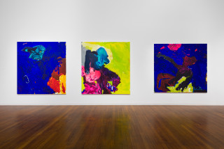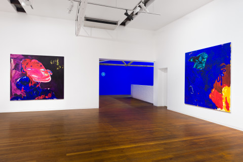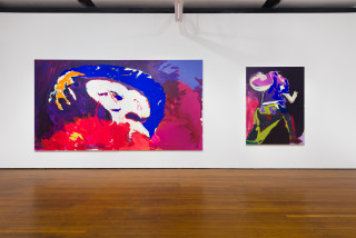 As we spend time with the paintings, we delve further into canvases full of contradictions – the gorgeous palettes clash with murkier tones that swim underneath - a muddy green with high-lights of orange accents a deep purple and stunning violet. Sickly lime green spills out of the vivacious Prussian blue and into the precarious neck of a giant, bobbing red head. ‘Do you have to let it linger?’ on repeat as one floats, like the nodding head, around the space.