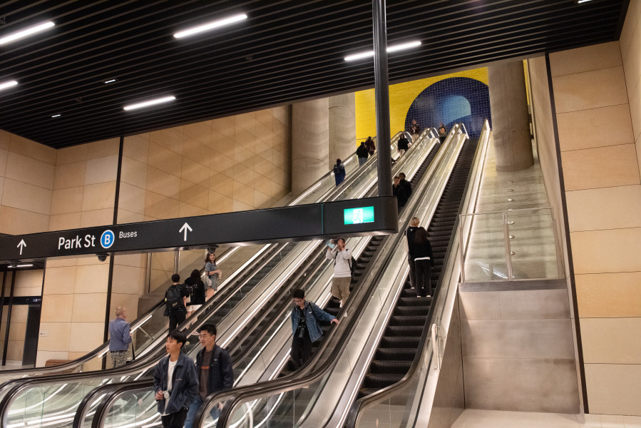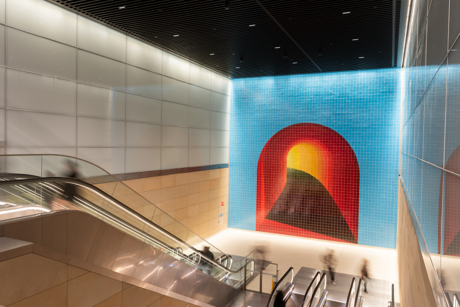 Callum Morton's The Underneath are two bold and monumental tiled artworks, mirror images marking both entrances of the new Gadigal Station. The tiled artworks suggest two ends of a connected tunnel snaking away into the distance beyond and beneath the station’s entrances.