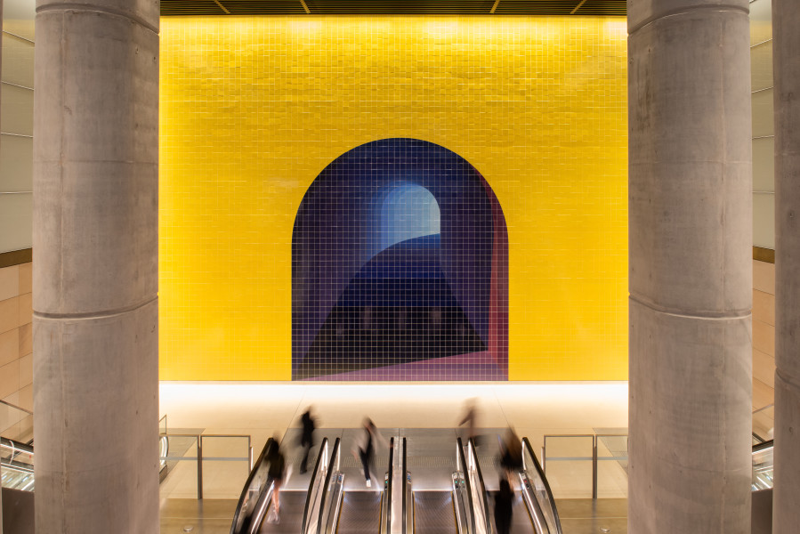 Callum Morton’s The Underneath are two bold and monumental tiled artworks, mirror images marking both entrances of the new Gadigal Station.