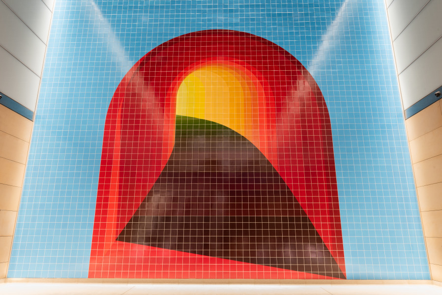The artwork’s clear glazed ceramic tiles, evoke a deep connection to the visual history of underground train stations.