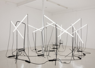 Bill Culbert Bebop, 2013; Furniture, fluorescent tubes, electrical components, wire, sheet glass; Permanent collection of the Christchurch Art Gallery
