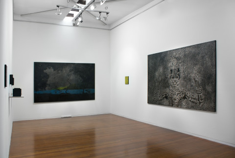 The paintings in A Darker Shade of Dark, are History Paintings – scenes and objects with cultural, personal and art-historical significance: a Mapplethorpe portrait of Grace Jones covered in body paint by Keith Haring; a view of Pentecost Island in Vanuatu where Boyd’s great great paternal grandfather was from; an Oceanic stick map from the British Museum; a sculpture from Vanuatu that was bequeathed to Picasso after Matisse's death; a kangaroo skull collected by Joseph Banks in Cooktown and depicted in a watercolour by Nathaniel Dance; a self-portrait of Matisse.