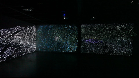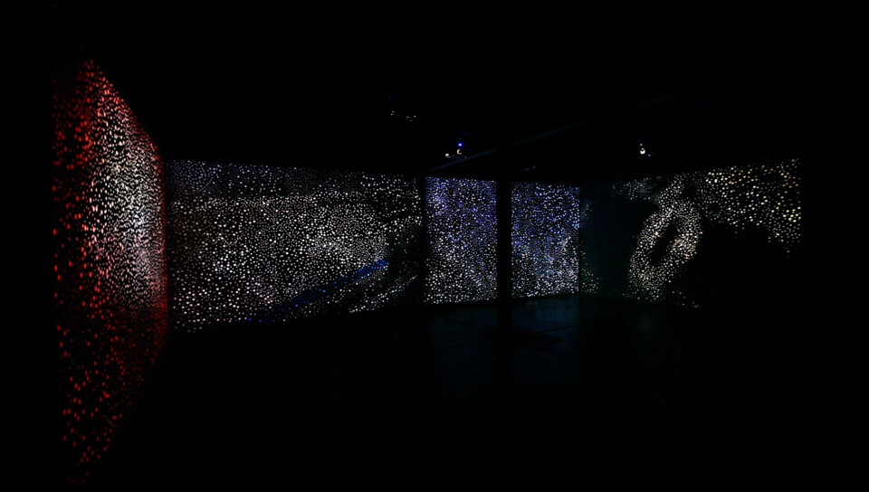 The mesmerizing effect of dots en-mass is further investigated in Boyd’s four-channel, floor-to-ceiling video projection, A Darker Shade of Dark 2012. Shimmering fields of coloured dots drift between what appears to be moving abstract images and figurative ones. The subject is dark matter, particle physics and indeterminate cosmologies. The soundtrack, commissioned for the work, is somewhat psychedelic and adds to the mystery of the work. It is dreamlike, cosmic and difficult to pull oneself away from.