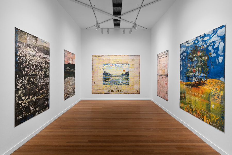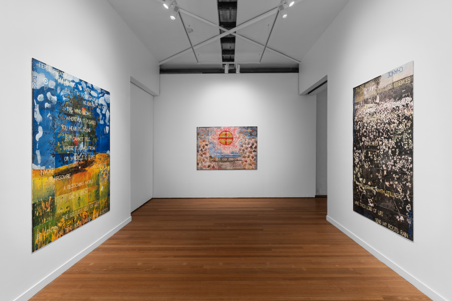 The multiple canvasboards that make up each painting in this exhibition are also pages within Imants Tillers’ ongoing painting project, named the “Book of Power”. Because of Tillers’ quotational methodology, however, it is not just his thoughts that fill this room and the metaphorical Book that lines its walls, but those of his source artists. Tillers’ Book is defined by a connective impulse that, though it relies on disparate material to form its contents, orchestrates convergences between both images and words across many eras, places and cultures.
