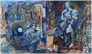 In earlier works Rubin has depicted this universe with cover-the-earth energy: massive elliptical epics about colliding tribes assaulted by Gotterdammerung weather. Helicopters wheel like rooks in landscapes full of writhing mustard-coloured rocks. A picnic of punk poets daydream a Wild West by George Grosz. Mile-long Dime Novel Dioramas stagemanaged by Max Ernst. The new work has more control, is more focused. Moving away from the domineering scale and Flea Market congestions allow his concerns to be more complex than the big picture morality of Daily News headlines. More than mere showmanship his skill of the involuntary has become more pointed and personal, more poetic and persuasive.