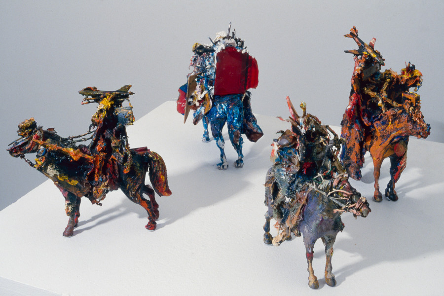 The Four Horsemen of the Apocalypse, all plastic and PVC, advance like hanging judges. Colourful shrouds of power, passing through eons and empires, through hailstorms of supermarket dreck, eating up space like a plague of dirty dishes. They are like the Marx Brothers singing "All God's chilluns got guns". And we're reminded that a real tank is a projection of a toy tank, made small enough for a child's hand and imagination to grasp.
