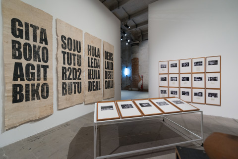 Curated by Okwui Enwezor, the 56th International Art Exhibition All the World's Futures featured Newell Harry's installation Untitled (Objects + Anagrams for R.U. & R.U).