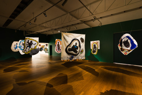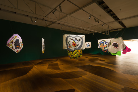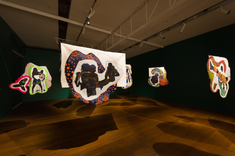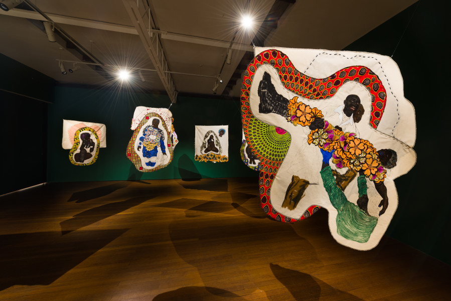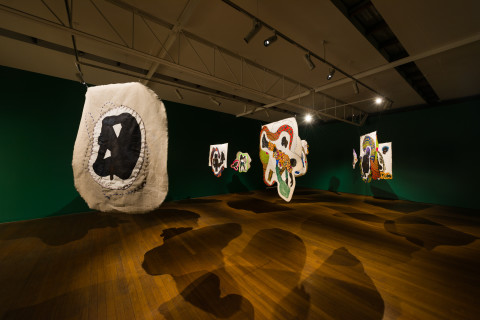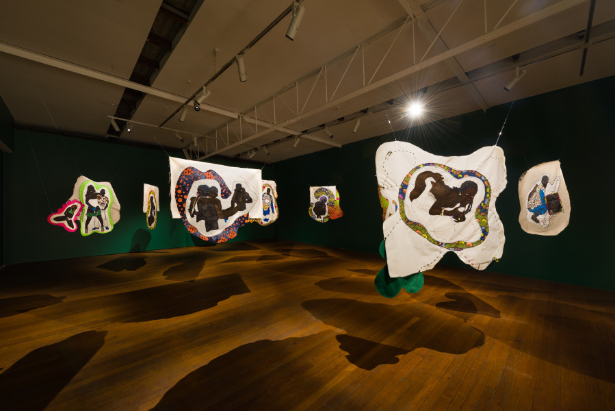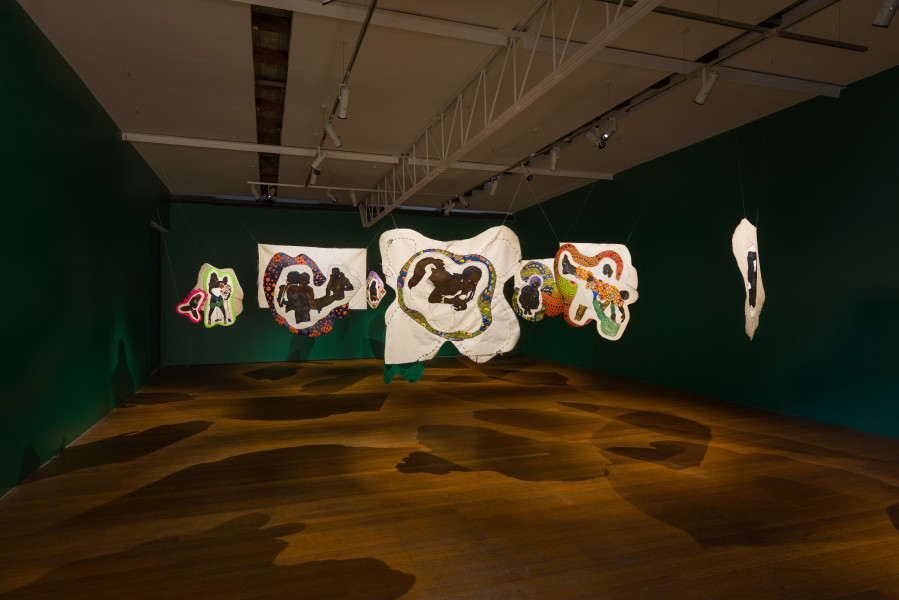 Mukeba’s earlier, expressive out-pouring of charcoal on paper has enabled the progression to a freer hand, allowing the artist to confidently transition into this thrilling explosion of colour and texture, coalesced with a refined drawing control where stitches echo brushstrokes and the canvas echoes sculptural forms. Strung from the ceiling within a dark green gallery-theatre, figures leer and parade in a forest of sin - provocative and confronting stories that dredge the dichotomies of human nature up from the depths. Suspended at eye level, we wind our way through a carnival of characters: devils and villains, prostitutes and iPhone addicts. Twisting and turning, we become quickly immersed in what feels like the heat of Dante’s Inferno. Weaving oneself into the story line step by step, stitch by stitch the action of the viewer – performative, deliberate – inserts a new character into the narrative. Swimming in this sea of delinquents, faced with Jung’s shadow, we grapple with our own position on religion and sin. Are we judge or executioner?