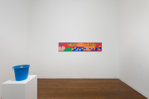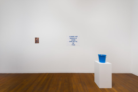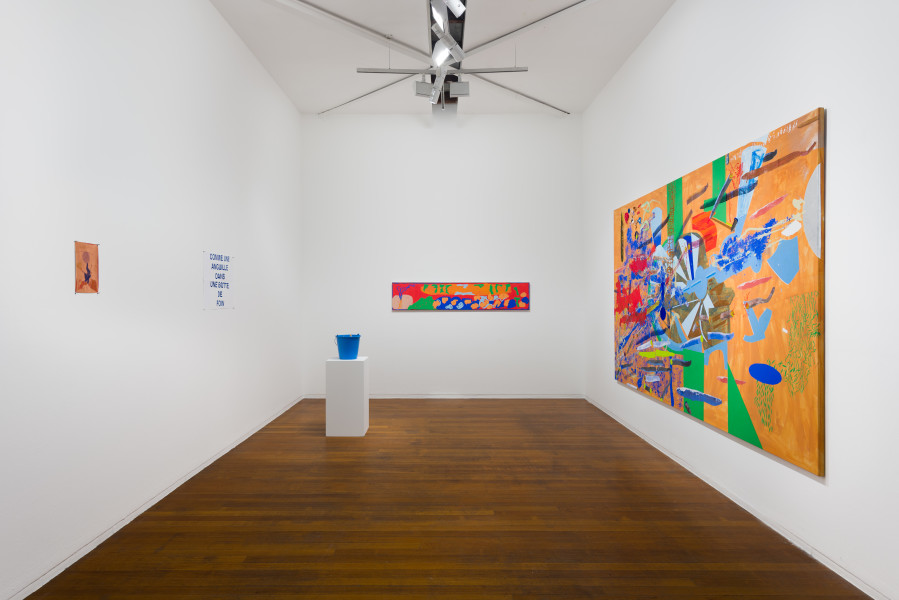 The painting titled Ass Assembly Ken Done Style is presented as a trace are shown concurrently in both exhibitions. While other works, such as Like an eel in a haystack / Comme une anguille dans un boite de foin, were originally exhibited in Assemblee desculs /Ass Assembly in Paris in 2017. The image of the devil, from previous performances, reappears in a reflection, a small shiny image absorbed into the veneer of the picture, no longer a monster, no longer a threat, the monster that-is-not, the monster that is whatever the other is.