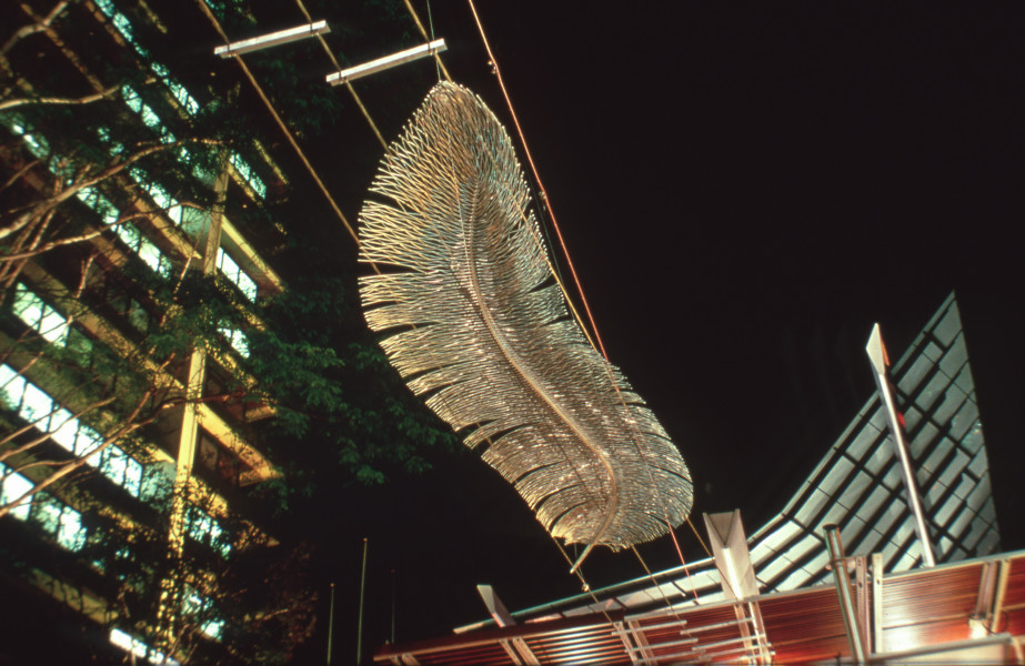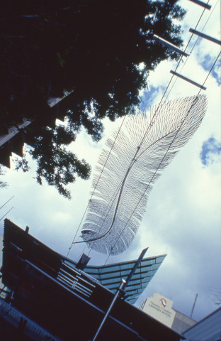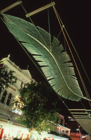 'Big Feathers' was commissioned by the Brisbane City Council in 1999. It is located at the heart of Queen Street Mall, the busiest gathering place in the city. The image of feathers connects to how birds use their plumage in social situations—the plaque reads "'Plumage' attracts attention, displays status and virility, beauty and availability, and indicates belonging to one group or another."