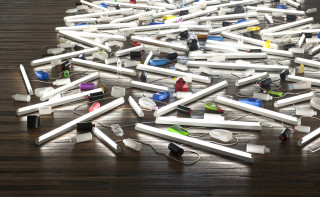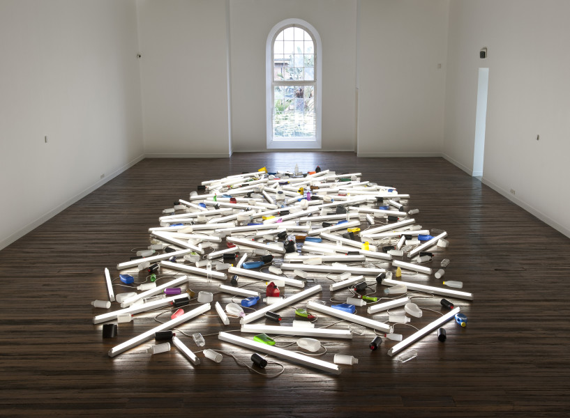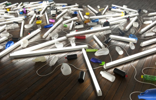 fluorescent light, electrical cords, black plastic bottles (5 litre)