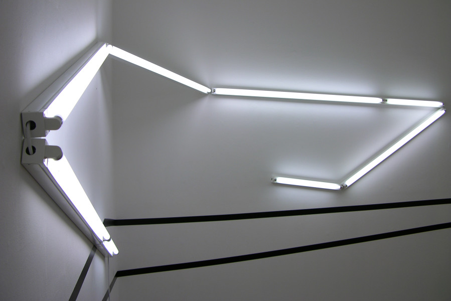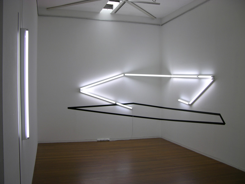 A large polygon constructed of fluorescent light and industrial casings, in Right-angle (black and light), straddles the corner of the gallery. The work overall appears to hover in the gallery space, and privileges the intersection of the wall, the corner, as the connection between two possible axes. At odds with this perception is the way in which the light casings appears to cling to the wall. Culbert severs the easy mirroring of the light-shape from the black lines we might read as a shadow. It is an entity that activates the gallery space on its own terms. The angles at which these components may correspond must be imagined, and this conception of an angle is as much part of the work as the physical object itself.