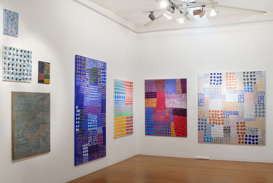 The paintings are captured forms of physical acts. The apparent ease of delivery belies the effort to explore and exploit a formal device. Colour. Circles. Repetition. Difference.