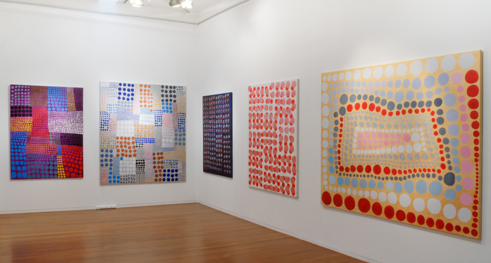 Angela Brennan’s exhibition at Roslyn Oxley9 Gallery features sixteen paintings of varying sizes from small to large, hung salon-style and in straight lines. The repeated motif is the circle, a basic shape we recognise everywhere, not forgetting the sun and moon.