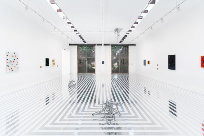 For Jim Lambie, tape is a medium. After making works by resurfacing clothes with tape in the late nineties, Lambie created his initial Zobop installation on the floor of his first solo exhibition with Transmission Gallery, Glasgow, in 1999. In so doing, he created a singular system for engaging with exhibition spaces that he has continued to use, to great effect and acclaim, ever since. “Starting with a single strip of vinyl tape,” says Lambie, “I trace the architectural edge of the room, following each previous line until the work meets itself in the middle. People often see rhythm, colour, and the sense of industry involved. However, my initial concern was ‘how to fill a space and empty it at the same time? Once I imagined the whole surface of the floor as a site for that question, the sticky tape I had been using to knock together smaller sculptures suddenly became the vehicle.”