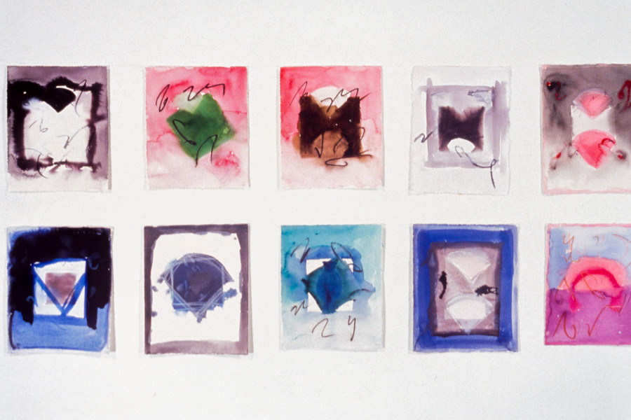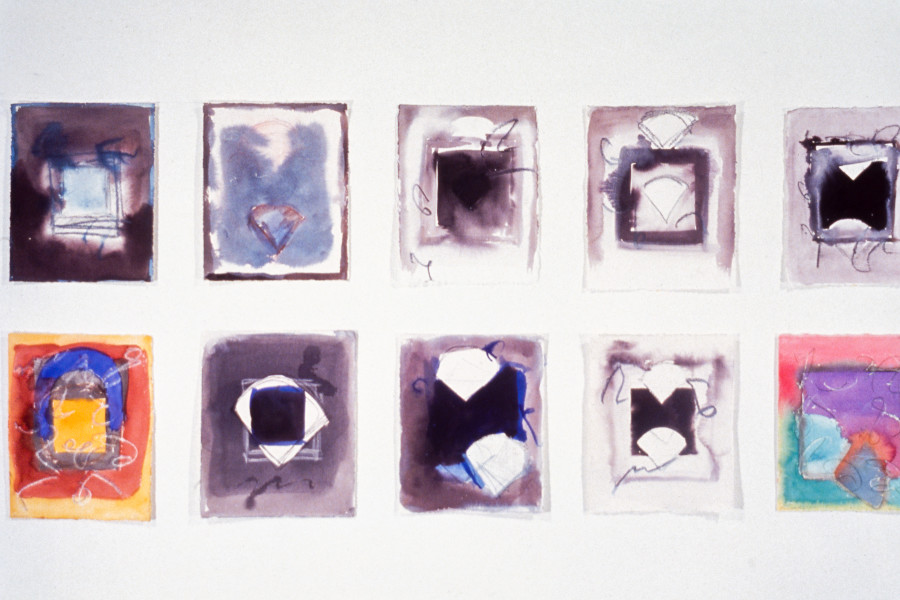 I have drips. They dissolve edges and break down shapes and structures. My painting medium is a clear emulsion and it transforms the rawness and materiality of the canvas. This is my way of going beyond a traditional way of working. The square, which is an understructure of my painting, impacts on the way my work is installed in the gallery. I like to hang my drawings like structural units in a grid. These grids function like open squares and echo the scale of the larger paintings. Sets of smaller paintings are installed in a linear progression to emphasize the continuity from one painting to the next.