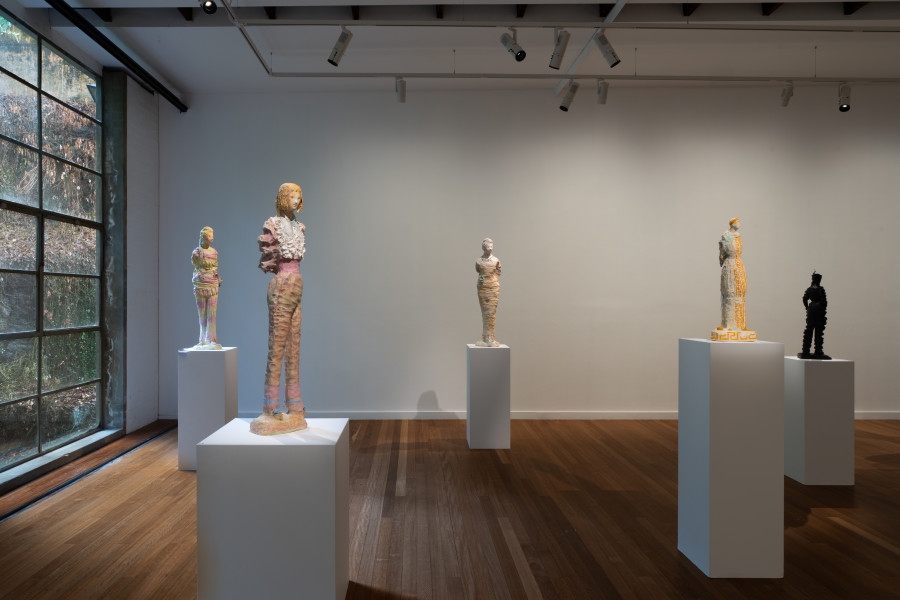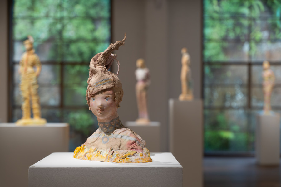 As we wind our way through the space, we encounter Marrinon's quirky troupe scattered across the gallery like debutantes awaiting their dance cards. Clad in flamboyant, pillowy dresses, adorned with flowers and swathes of gorgeous silks and bouncing taffeta, they appear expectant – eager to catch the viewer’s eye or to take a turn around the room. Rendered in lollipop hues and texture reminiscent of icing on a cake, these delectable figures are Marrinon's sculptures expanded to nearly life-sized scale. They are bold, beautiful and endearingly sassy.