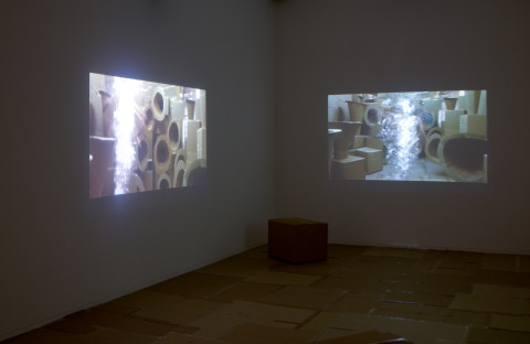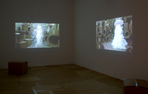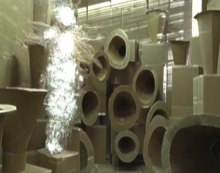 Justene Williams’ three channel video installation, FEMMZOIL, is a futurescape ( -ism, -ama), a victory—a “fist-and-cane-fighting”—of poor materials and neutrality (cardboard, photographs, tape, androgyny) to accommodate a mesmeric dance lubricated by transcendent noise.