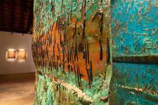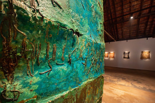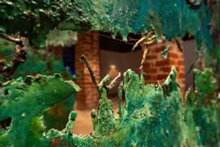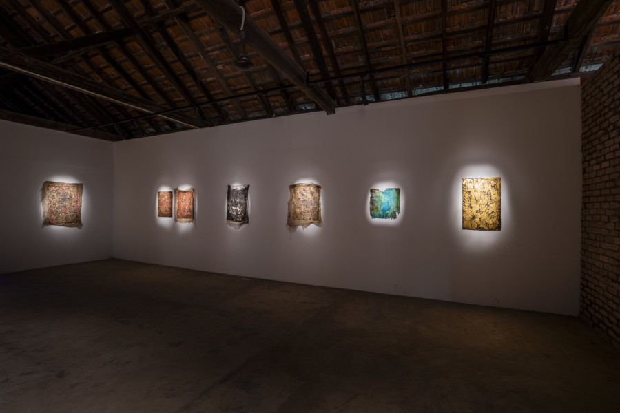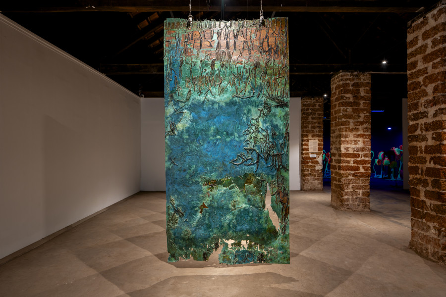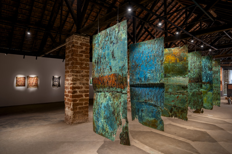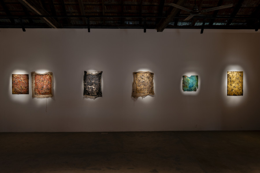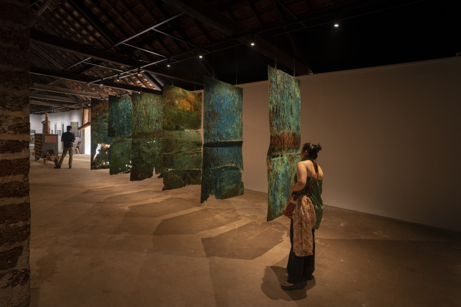 In Chronicles 2025, viewers are invited to witness the volatility and swathes of time that inscribe the series of suspended, sea-green copper plates with layers of crusting, peeling patina. Cotton lamp wicks, dipped in tar, are embedded across the plates. Here, a familiar material becomes unrecognisable in an altered context. Through heating, embedding, casting, acid exposure, or oxidation, Kain interrogates the various registers of copper—shiny, solid, brittle, and crumbling. Kain’s intuitive manoeuvring of each of these ancient materials and their potent gesture at rich, multivocal Dalit histories that are undocumented but have been passed on, at least partially, through memory, embodiment, and a relationship with the earth. Kain seeks to honour this inheritance and mark out the absences in the historical record of Dalits across India and the diaspora.