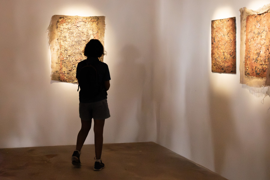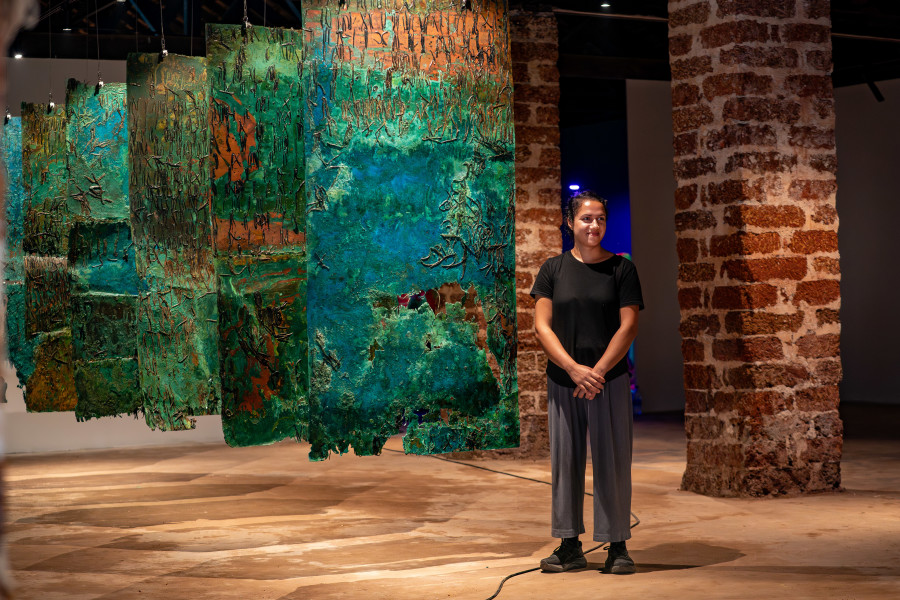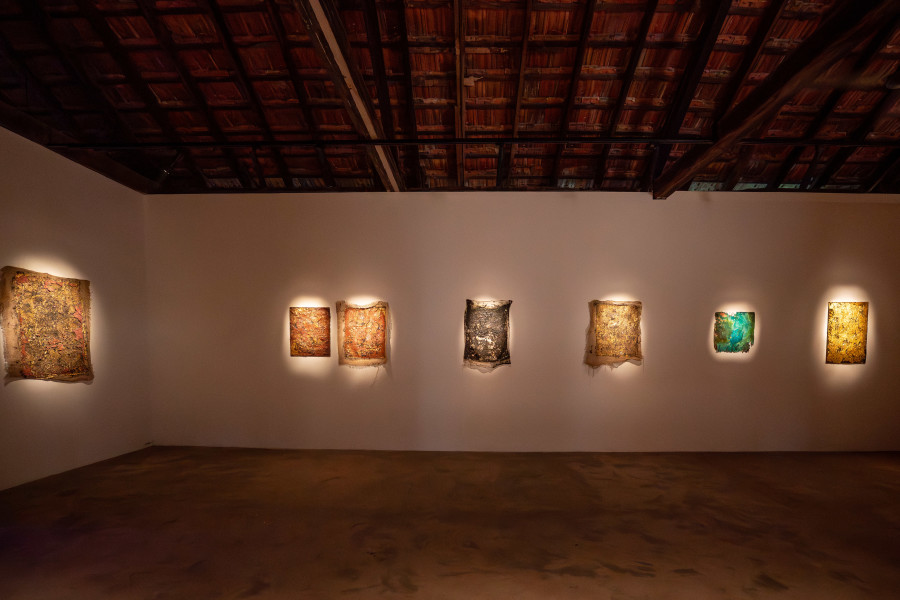 At the Kochi-Muziris Biennale, Kain presents works in tar and gold leaf, as well as a series of suspended copper plates that punctuate the viewing space. The tar canvases repeat self-citation, with each work having begun from a silicon impression of another. The result is a series of interconnected terrains, non-linear in their timeline, but with absences and oddities that are reminiscent of one another. In Mimetic 2025, the tar appears cracked like earth charred under extreme heat; in another, a terrain with similar texture is enlivened by gold leaf and red pigment over the tar. For Kain, this is not abstraction for abstraction’s sake, but rather the presentation of a unique language co-created with historical materials using her own physicality, intuition, and memory. It carries the multiplicity of Dalit inheritances and experiences, particularly those of Dalit women.