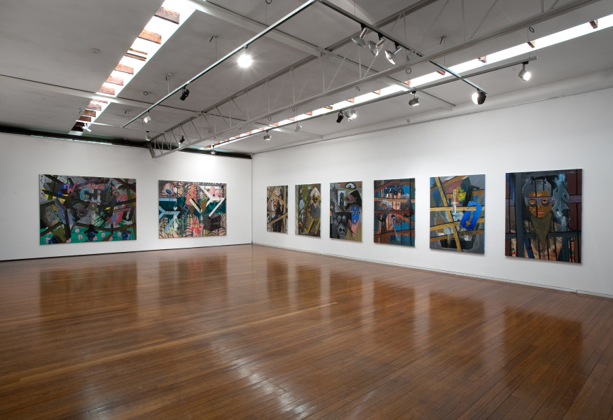 As much as the works from Frat of the Obese are founded on recurring images from Griggs’ atlas of the place in which he has situated himself to for the last two years, these icons merely form the axis which his language navigates. Painting for him operates more on the syntax of elements – blending incongruous emblems and slogans, making portraits while making a return to basic forms.