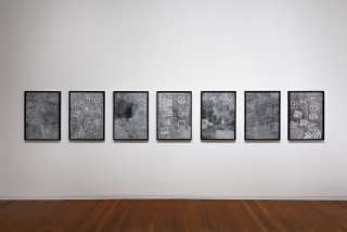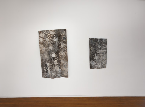 Nyapanyapa’s famous late sister Gulumbu Yunupingu painted stars, which referenced the seven sisters story. Her work is a permanent fixture in the Musée du quai Branly in Paris. The major proponent of this Yolngu story in art history is Munggurrawuy Yunupingu who painted it on bark frequently. He was a legendary artist and political leader and father to many children, including the seven Yunupingu sisters who created the Seven Sisters Project of large prints in 2011. Both Nyapanyapa and Gulumbu made work in this project but sadly since that time three of the sisters including Gulumbu have died. In picking up the motif of stars in this latest exhibition Nyapanyapa is memorialising her deceased sisters Gulumbu, Barrupu and Djawundayngu.