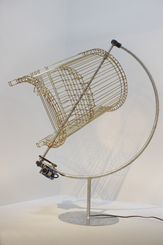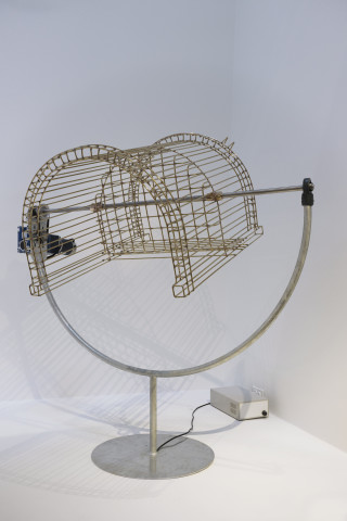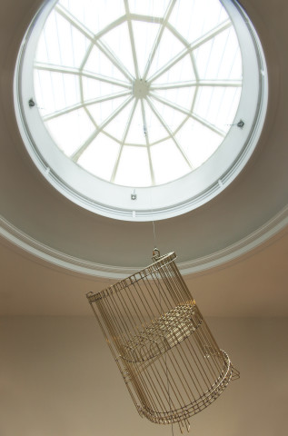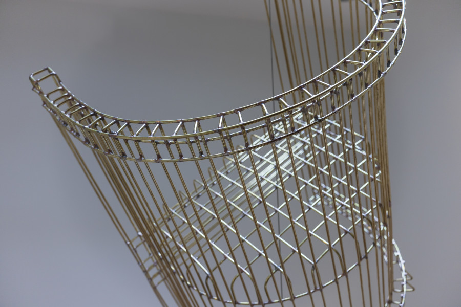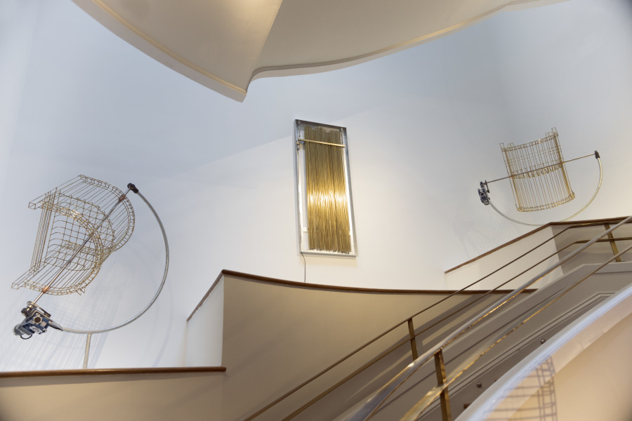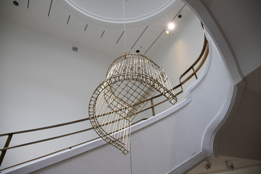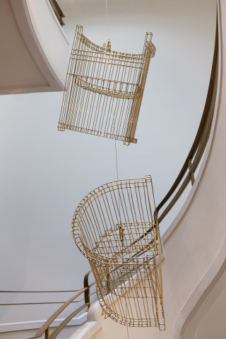 Inspired by the dramatic architecture of the Phillips’s Goh Annex stairway, Dawson produces two groups of kinetic sculptures that accentuate its spiral configuration. In the first group—comprised of five chairs made in brass and suspended from the dome at different heights and rotating at different axis points—the artist creates a dialogue with both the stairway railing and the Phillips’s early Modernist-Arts-and-Crafts-style chairs. While the shape and size of Dawson’s chairs mirrors the Phillips chairs, the brass he uses is the same as the brass used for the railing. Whereas the museum’s chairs are heavy and sturdy, Dawson’s are weightless and almost translucent; they function like ethereal ghosts of actual objects.