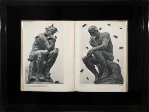 Kobyashi Issa said 'where there are humans you'll find flies – and Buddhas'. In Nell's version of the bodhisattva’s quote, flies have descended on Auguste Rodin's The Thinker. Her playful addition of fly stickers to the canonical sculpture is a humorous take on art history, spirituality and decay. If you sit still for long enough, you will gather flies. Opposite the doubled Thinker is a three-dimensional meditative figure cloaked in flies. Another ‘Nell-sized’ object, this woman sits in the lotus position with a fluorescent light emanating from her core. In contrast to her reflective position the figure's skin is crawling with flies. Like a beekeeper that is able to be engulfed by bees without being stung, Nell's meditating figure covered in flies appears to be at equilibrium with nature.