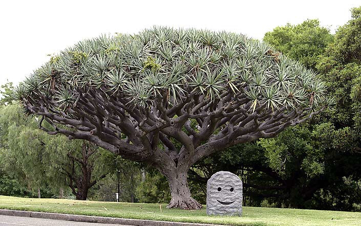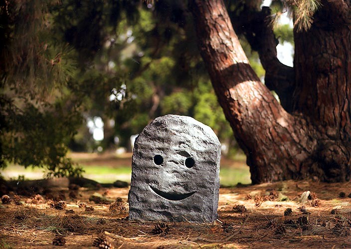 Happy Ending is a simple, curved arch, granite gravestone absent of text, epitaph or dates. Chiseled into the headstone is a universal uncomplicated face, just two eyes and a smile. With a face, a personality and a smile, the bereavement and finality attached to a gravestone can flip joyously into the territory of serious humour and dark playfulness. The intentional naivety of the contented face communicates the last gesture of a simpleton. Content, because the simple soul knows that this moment and this life are never to be repeated again in all of eternity. In the face of it all, arising from or sinking into the earth, good or bad, right or wrong, happy or sad is Thich Nhat Hahn’s mindfulness mantra present moment, wonderful moment. Happy Ending says hello and goodbye to THIS moment and THIS life.