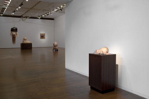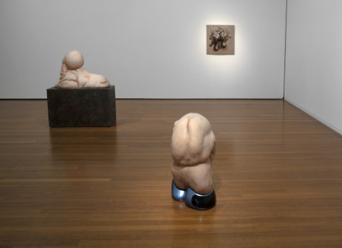 There is a similar abstract corporeality in a group of new sculptures; Ghost, Atlas and Sphinx. These works reflect on the contemporary understanding of the body as essentially mutable. From the very cellular level of organisms to the physical appearance of people, we now expect everything to be changeable to suit our desires. These sculptures are quite instinctive, very much my drawings made ‘flesh’ and as such portray a more enigmatic narrative. The hyperrealism of my sculptural process is subverted by the deliberate anti-naturalism of the forms themselves. There is none of the certainty that you usually find with highly realistic figures. It is hard to gauge whether they are literal or metaphorical. In Sphinx, there is a reference to the use of bodies for production, with the head sheltering what appears to be a human organ. However, this glistening object could just as easily be a large bean or seed. Sphinx is an expression of raw fecundity. It references ancient sculpture which reminds us that the earliest sculptures - the Stone Age Venus figures - were depictions of fertility.