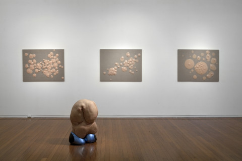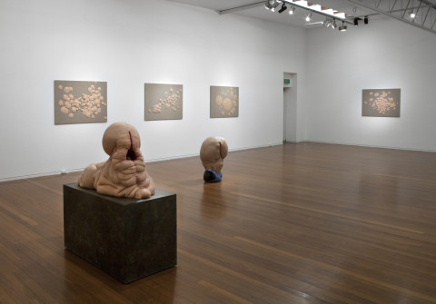 Formally, the voluptuous, amorphous, liquid forms and their resulting accretion and accumulation recur throughout the show. We see them in the paintings and in the amorphous fleshy forms of the sculptural works. The paintings come almost automatically, an interplay between silicone’s natural tendency to flow and accrete and my own desire to control it. I mostly use silicone to mimic these material properties of flesh. Like all great mimics, silicone is a paradox; best known for being something else. I have become increasingly interested in the material itself; in the backs of moulds and the inside of castings, in the overflows and errors. I find the spills and drips both fascinating and evocative because in some ways it reminds me of the creatures I create; unlovely and unwanted yet beautiful and irrepressible all the same. In the studio we collect these overflows to keep as tests and to feed back into the process of refinement and increased verisimilitude. However, I see a beauty there that I find compelling and evocative. In the form of paintings, they are abstract but seem to suggest complex micro-structures or macrocosms.