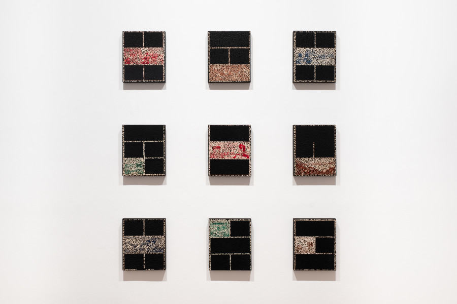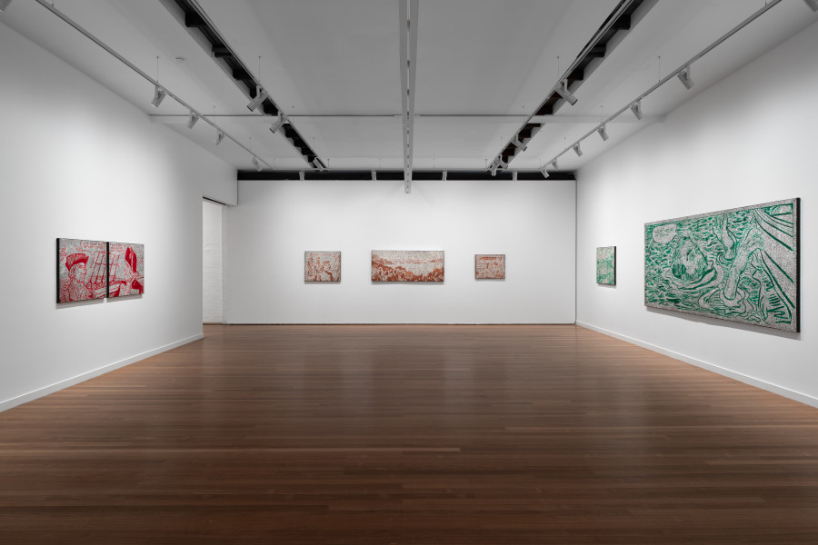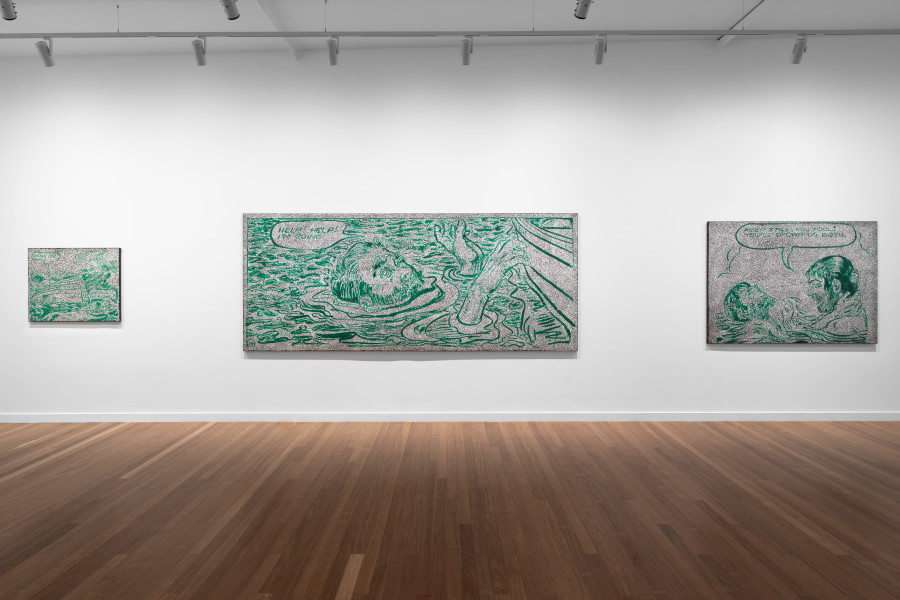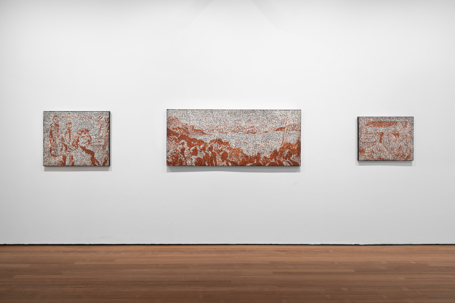 Comprising a suite of new paintings alongside an extraordinary three-panelled mirrored work, I’m Going, Daniel Boyd’s tenth exhibition with Roslyn Oxley9 Gallery, continues his incisive investigation into history. Taking visual references from mid-century children’s educational pamphlets – comic-strip style social studies texts from the 1950s that once presented a reductive, one-sided account of Australia’s colonial past – Boyd uses his signature pointillist technique to redact and disrupt these narratives. In doing so, he creates images that speak to the instability of historical truth and the ongoing possibility of re-reading the past.