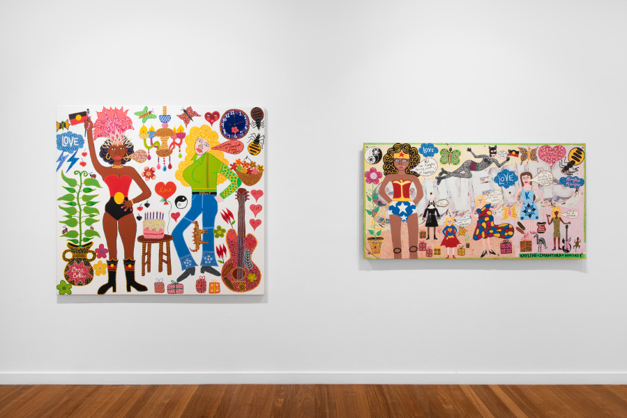 In Indulkana Soup, Kaylene Whiskey’s vibrant artworks celebrate strong, resilient heroines—from Dolly Parton and Wonder Woman to biblical figures—imbuing them with themes of empowerment and self-determination.