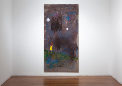 Watson describes the three paintings as taking place in ‘non-specific spaces’ or fantasy worlds. Girl in a blindfold, is, as the name suggests, a child in a blindfold. Sleeping beauty, is a girl asleep on a fantasy bed, and Solar Treasure, a girl depicted from behind staring out at the universe. The expanse of green we see in Girl in a blindfold, suggests the countryside but beyond that we cannot be sure what is going on. Sleeping beauty is a pink fantasy interior of a sleeping chamber; it could be from a fairy-tale inside a castle with its ornate hot pink wallpaper and adorned bed linen. Likewise Solar Treasure with its dark purple sky, the stars, planets and moon invites the viewer to question the infinite expanse of the cosmos or as Watson calls it, “the whole other thing out there”.