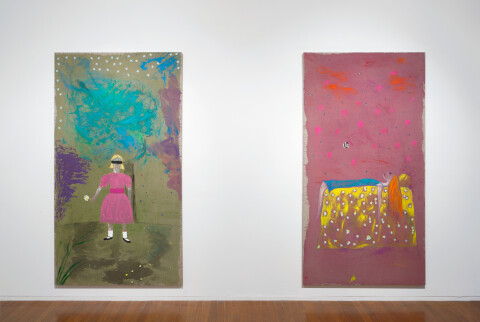 In this exhibition we see Watson’s signature large-scale paintings on Belgian linen. Each, features a solitary figure and a high key palette, made using an assortment of haberdashery diamantes and cardboard cut-outs providing a counter to exquisite Japanese pigments, acrylic and rabbit skin glue.