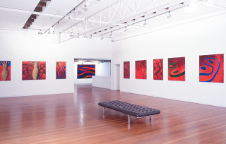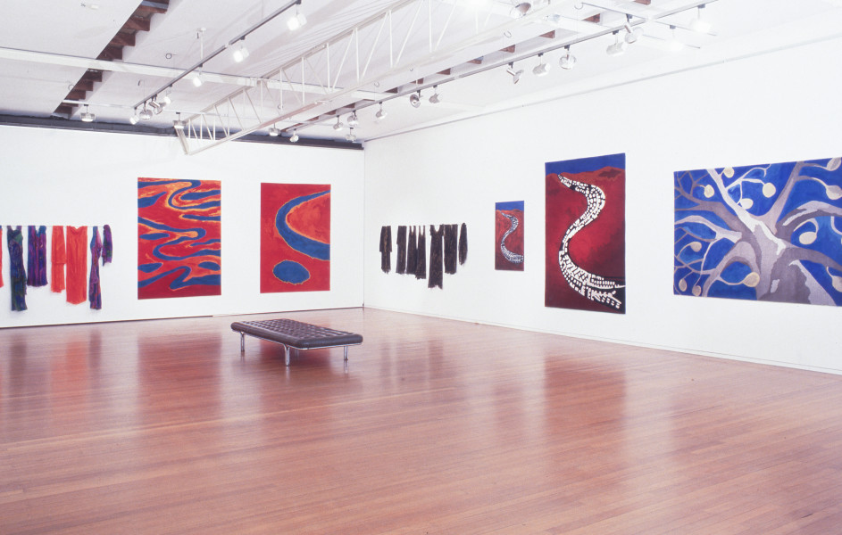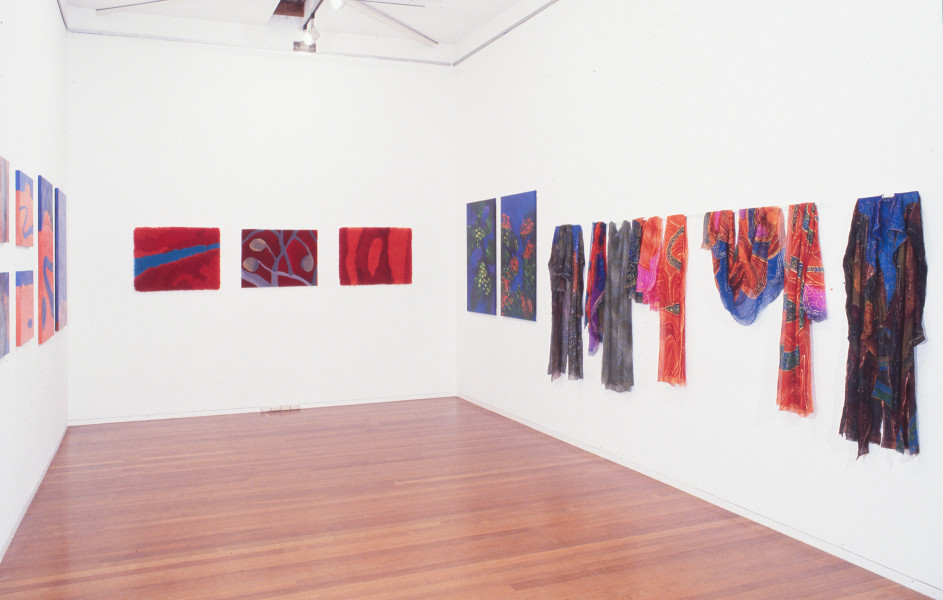 During 1996 Jackson lived in Broome on an Australia Council Fellowship, concentrating on painting and rug design. This resulted in a body of work entitled Perl Coast paintings and Indigo textiles, incorporating African and Japanese methods of dyeing and patterning cloth. In 1997 Jackson returned to Alice Springs, where she continued to focus on her painting. She also spent time working on a textile project with the women from Keringke Arts at Santa Teresa Community. The work in the exhibition charts a journey, with Jackson's symbols and images evolving into simpler and more essential expanses of colour and shape. This current show is the culmination of two years' work, including paintings, rugs, and chiffon fabrics or "ethereal landscapes".