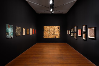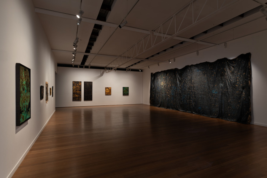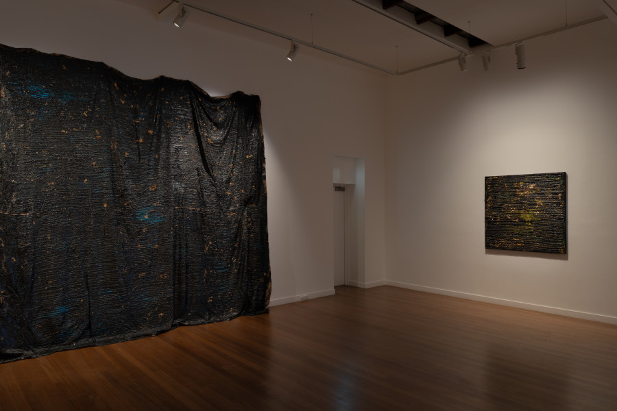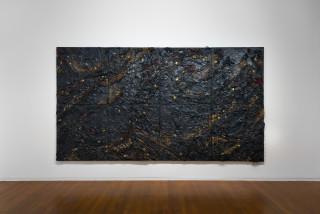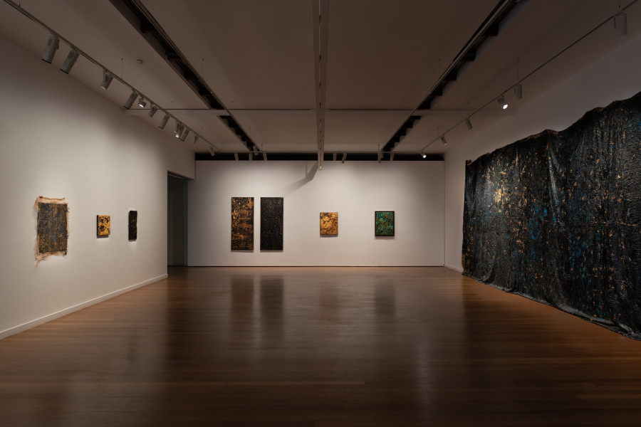 Anchored by the curtained backdrop of an epic and enduring weight is her major piece Midnight. Histories are held together in a night sky – the weighty drape of the past in tar, blue pigment and gold leaf, at once suspended in space, appearing to float and move yet groaning in heavy stillness – the inherent ambiguities creating a palpable tension.