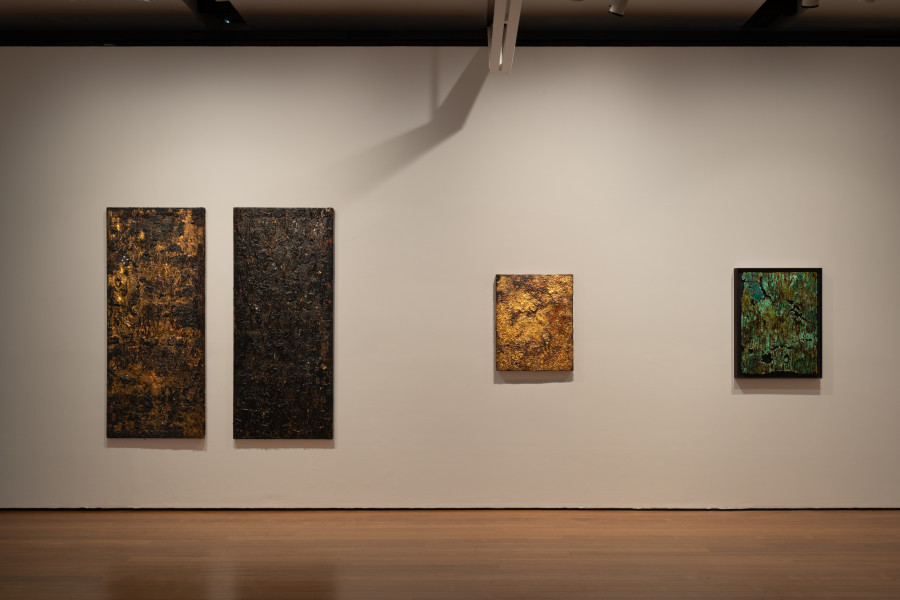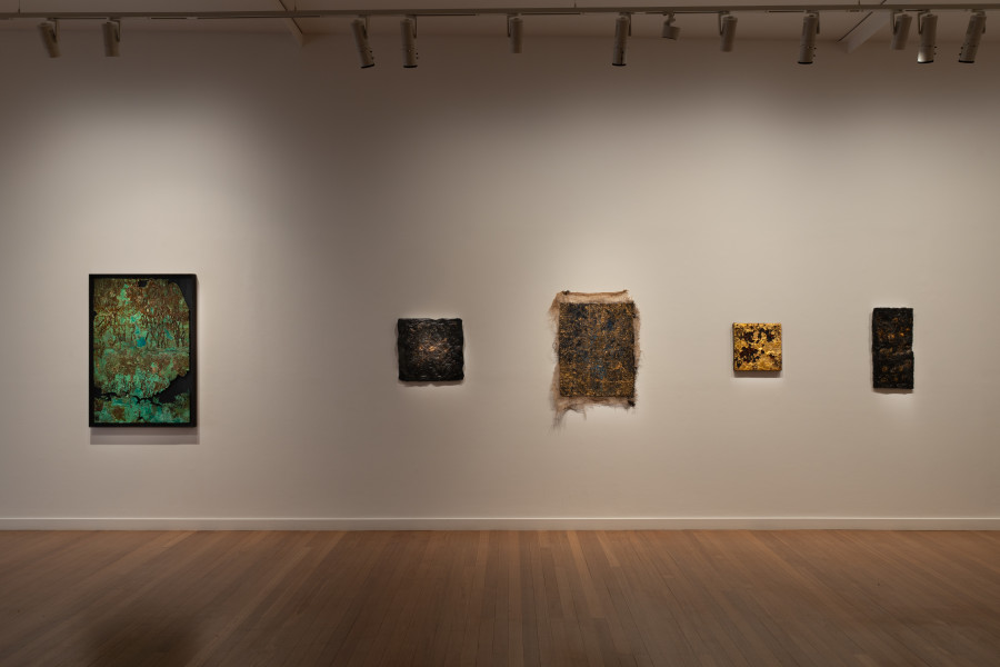 Within the layered intent of these dazzling works are sumptuous dreamscapes of gold leaf and burnished copper, where relics in glinting sea green mingle with metallic blood red that drips through the gilded skin of time. Works appear to be excavated from the twinkling heavens above or unearthed ruins from the depths below – they are delicate, fragile remnants from the past yet embedded firmly in the fictions of our time.