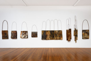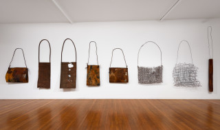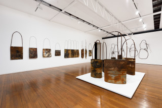 Lorraine Connelly-Northey has been creating narrbong-galang for close to two decades, using reclaimed and weathered farming materials – rusted tin, burnt barbed wire, steel pipe, fence posts, perhaps a mattress frame from an abandoned home. In using this debris of recent rural agriculture, Connelly-Northey speaks to a complex relationship across pre- and post-colonial Australia, whilst asserting a story of resilience within an environment that tends to
