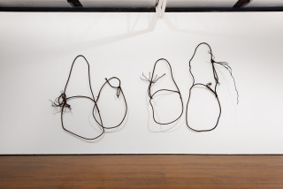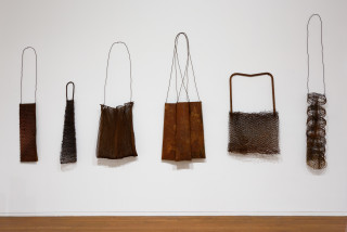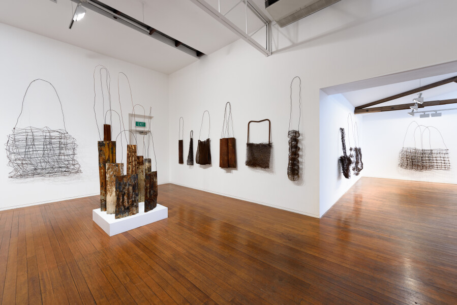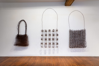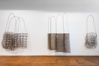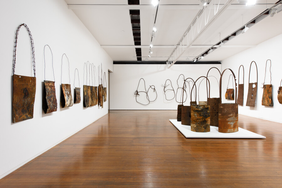 Lorraine Connelly-Northey was born in 1962 in Swan Hill, Victoria. She Lives and works on Waradgerie (Wiradjuri) Country, New South Wales. Connelly-Northey uses Aboriginal coil-weaving techniques to transform found industrial and organic materials like corrugated iron, fencing wire, feathers and shells into traditional forms such as koolimans (bush bowls) and narbongs (string bags).