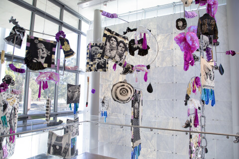 Nikola Tesla sends Theda Bara to Mars is a cinematic universe in which film references are pulled apart and reinterpreted using a wild array of materials and mediums. Characters and props collaged with sparkling, suspended textiles and fleshy sculptural forms drip from the ceiling via unexpected structures and flamboyant mobiles.