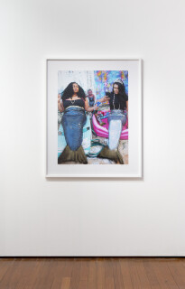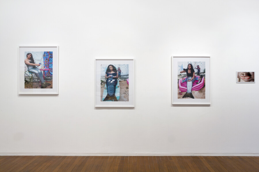 The Fish out of water series takes off from Deacon’s 1995/2004 picture Last laughs in which three young women crammed into one frame and dressed for partying laugh their heads off (or are they all laughing?). This new trio of bored mermaids, fish out of water in separate frames, find different ways to amuse themselves solo – a smart phone, a pack of cards and two cocktails and a hose. The mermaids are Savanna Kruger, the daughter of one of the party girls in Last Laughs, and two of Deacon’s nieces, sisters Sofii Belling (Little Miss Wonder, 1995, Moomba Princess, 2004), and Inyaka Saunders (the 2001 video Forced into images, Princess Security, 2009)