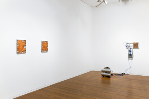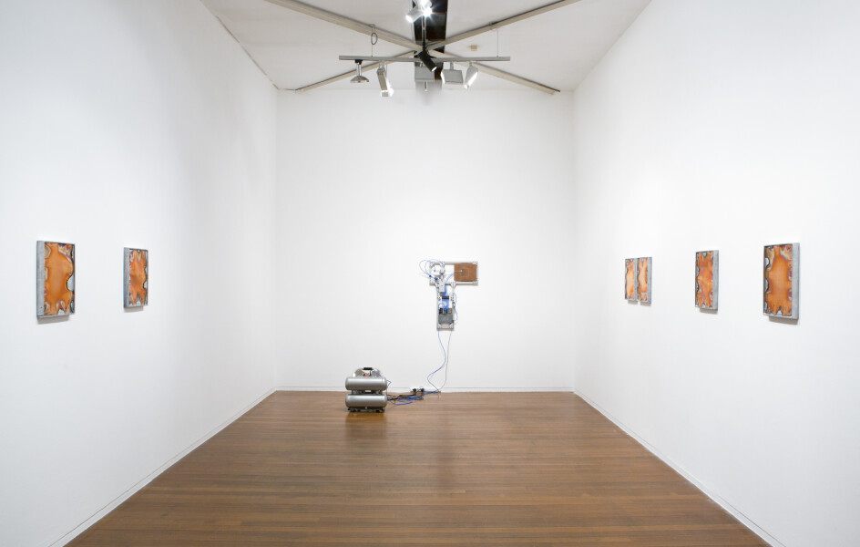 Wildflowers don’t care where they grow, (2016) is a computer-programmed pneumatic system that polishes a section of a copper etching plate. The polished section reflects the machine’s limits. The up/down and left/right motions continue until they hit limit switches. Wildflowers don’t care where they grow (2016) is a stand in for the artist, an outsourcing of labor that replicates the hand-polishing process he undertook for his Landscape/Constellation series, the rejects of which were cut up and melted for the Palethorp series.