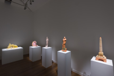 The material lushness and delicate palettes [of Marrinon’s new sculptures] render them sensually appealing, while their art historical erudition and technical aplomb place them in a familiar continuum of neoclassical aesthetics. To this Marrinon adds contemporary twists, at times seemingly incongruous elements such as state of the art technologies or fashions, that trigger bemused recognition in the viewer.