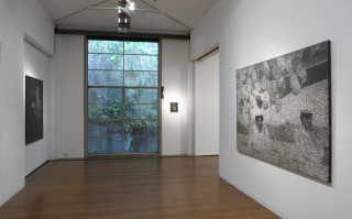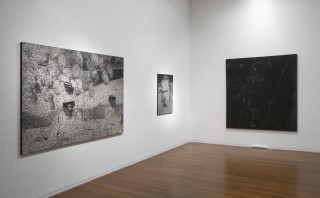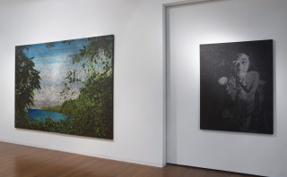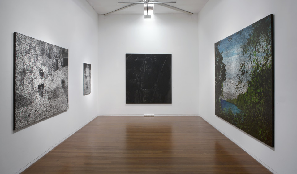 Daniel Boyd’s ‘history paintings’ are rich with narrative. Inspired by archival photographs, Boyd re-imagines historical moments in his work. A veil of resin dots is applied to each painting causing the images to shift between figuration and abstraction – depending on your distance from them. These dots or ‘lenses’ trap tiny sections of the narrative before the scenes are painted over in black. The resulting images are visible only through the shimmering glue lenses, a poetic analogy for the process of memory and the multifaceted nature of history.