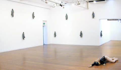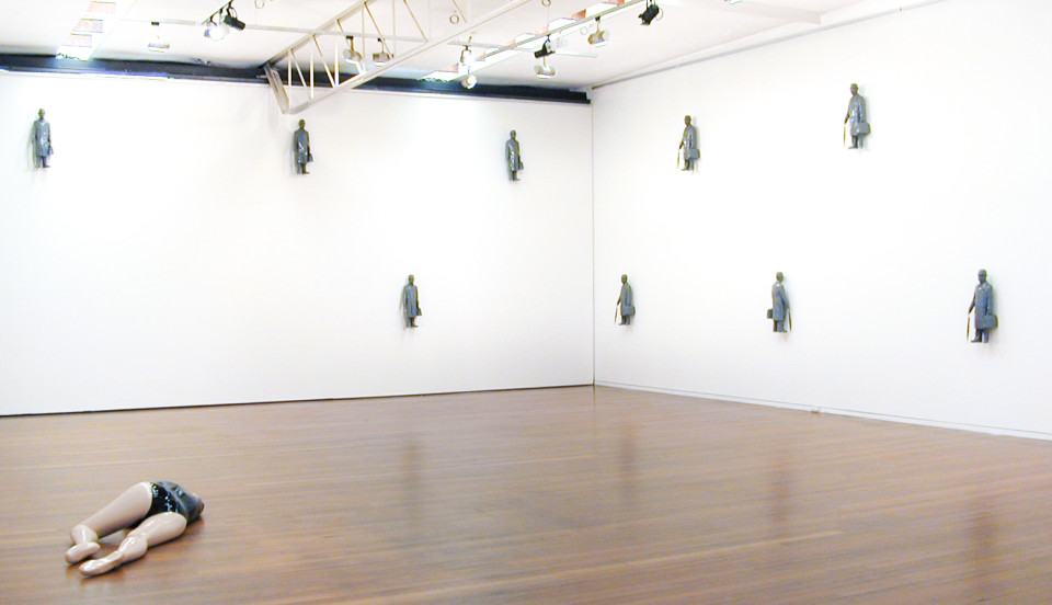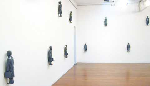 Arriving in the gallery, climbing the stairs and turning around to enter the main room, there is a mounting physical presence. Something is quietly imposing upon space that is normally unoccupied. Initially it appears quite high up, about the walls above head-height. It develops into a pattern, more-or-less regular. The white walls of the gallery are studded with small monochrome human figures, uniformly gloss grey. Together they create a wallpaper of sorts that is three-dimensional, activating spatially the routinely flat superfice of the wall. These figures emphasise at once the broad expanse of the wall and the open space as such that attends it. They indicate demonstratively that invisible thing which connects the viewing subject to the limits of the space they occupy, rendering it palpable. Shifting focus away from the magnetically phenomenological character of the work, we notice that the attire of these small male figures is somewhat peculiar: long coat, bowler hat, umbrella and briefcase. These characters are blandly and dutifully bureaucratic, reminiscent of the surrealist René Magritte’s famous painting in which an urban sky is filled with similar floating figures. Entitled Rainbow Servant Dreaming (2005), they are miniature portraits of expressionlessness and monotony that encroach upon and emphasise our habitual and mindful inhabiting of space by borrowing a trick from the master of surreal effects. They are little guardians, sometimes watchful, sometimes not.